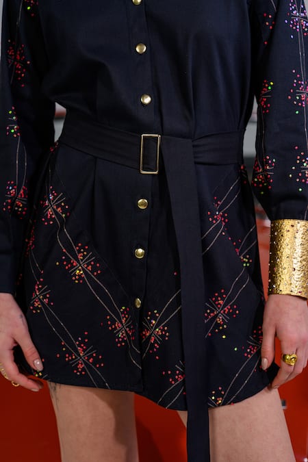 Black button down dress featuring cut and sew panel design with sequin placement embroidery. Paired with a matching belt and attached lining for added comfort.