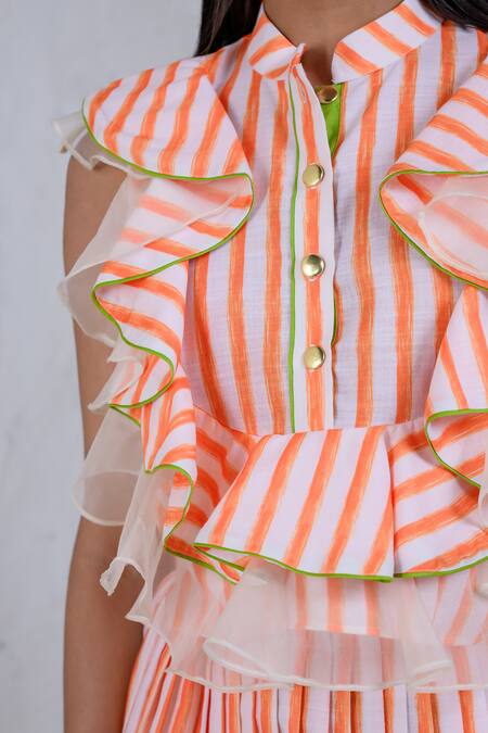 Orange art twill & organza ruffled top featuring a striped print. Paired with a pleated skirt with a side zip closure.