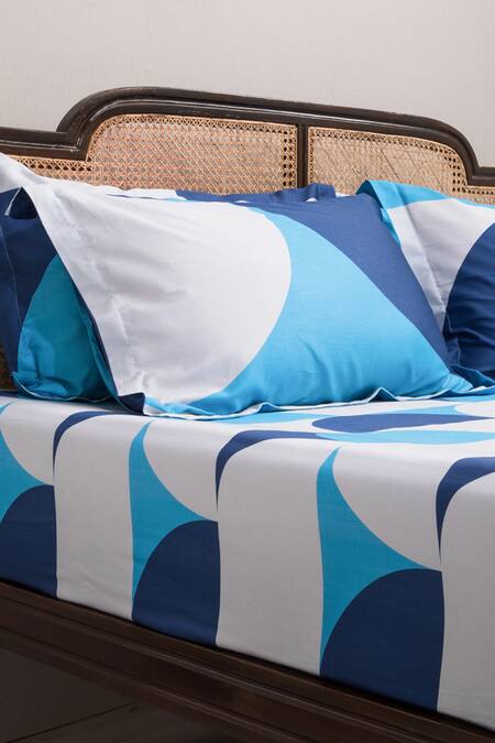 Blue cotton bedcover with sateen finish & all over monochrome scallop pattern. Comes with matching monochrome set of 4 pillow cases.