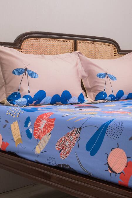 Blue cotton bedsheet with sateen finish, all over contrast flora & fauna pattern. Comes with matching contrast set of 4 pillow cases.