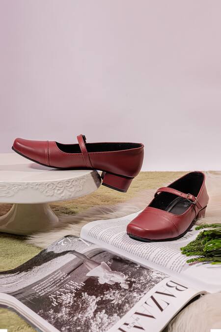 Crimson red vegan leather Mary Jane block heels featuring stitch lines detailing