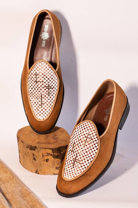 Brown loafers featuring a suede finish with a checkered front pattern and cut dana work highlights