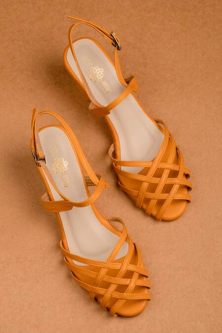 Yellow wedges made from vegan leather featuring front criss-cross straps
