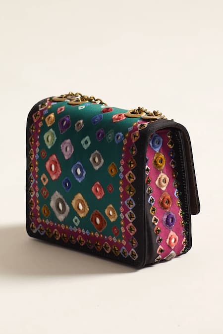 Green sling bag featuring bandhej print with french knots and mirror embellishments