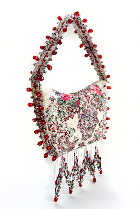 Bead tassels along the handle, Sequined floral embellishments, Attached lining for durability