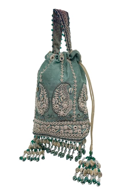 Green Embroidered Awadh Bead Tassel Polti Bag