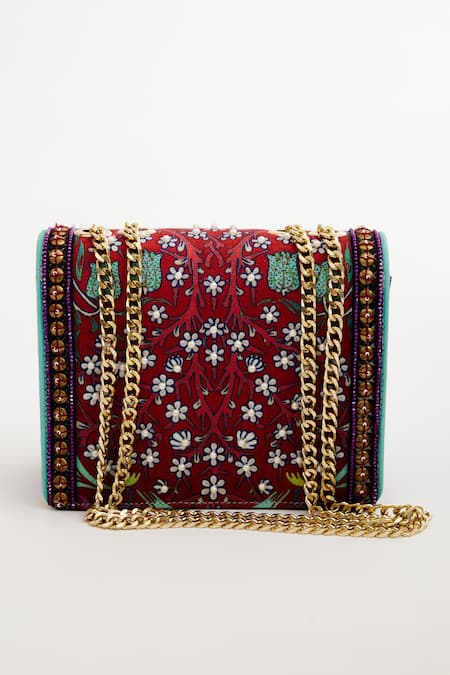 Red sling bag featuring a box shape with an envelope flap and all-over floral wallpaper print