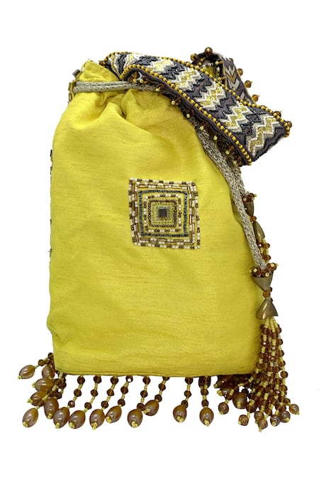 Yellow potli bag featuring all-over geometric motifs and embroidered wristlet