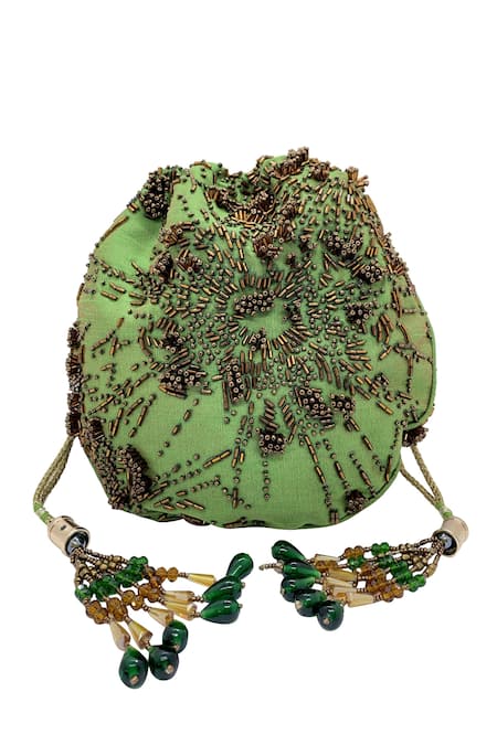 Green potli bag featuring all-over nalki work and drawstring bead tassels
