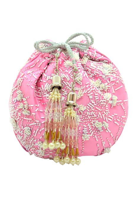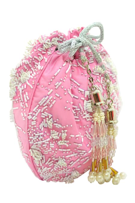 Pink potli bag featuring all-over nalki work and drawstring bead tassels