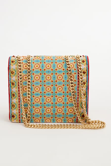 Beige sling bag featuring an all-over leafy foliage print with bead embellishments