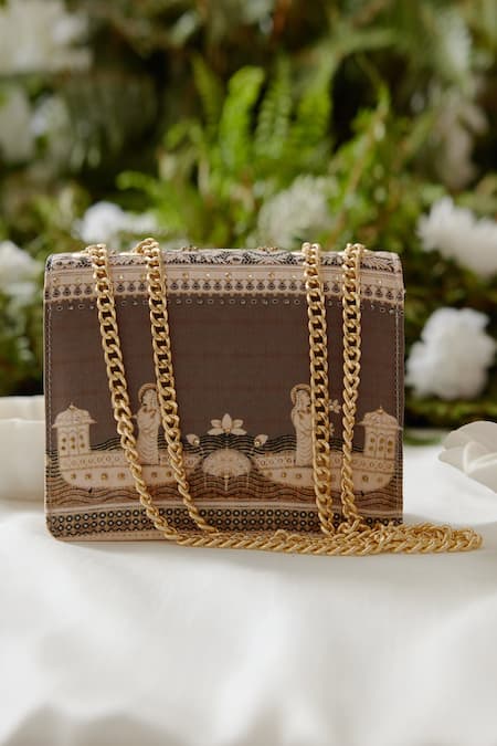 Charcoal satin sling bag featuring an envelope flap with a figurine girl, trees, and boat print