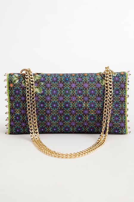 All over varied tiles pattern, Rose print with bead embroidery, Metallic sling chain for versatility