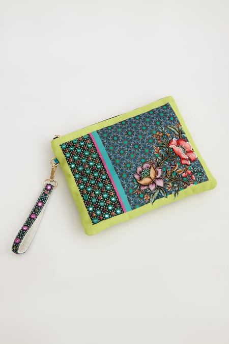 Yellow wristlet pouch featuring lime floral and geometric tile print