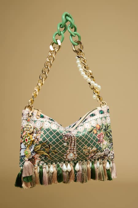 Green handbag featuring printed floral Mughal motifs and embellished with stones, pearls, and bead drops
