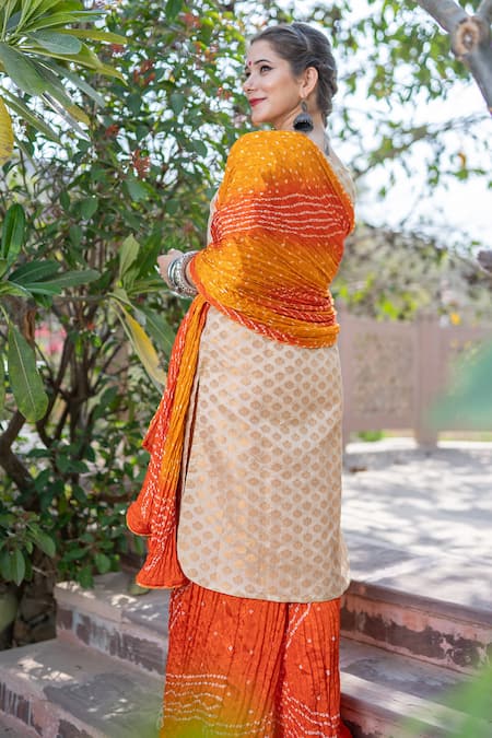 Off white banarasi kurta featuring an all-over woven floral pattern and gota lace work details. Paired with orange and yellow bandhani palazzo and an embellished dupatta.