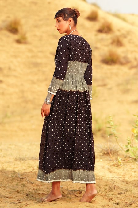 Black Cotton Mirrors, Embroidery V-neck Bandhani Tie Dye Dusk Dress