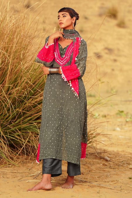 Grey Crepe, Cotton Mirrors V-neck Bandhani Tie Dye Work Kurta Pant Set
