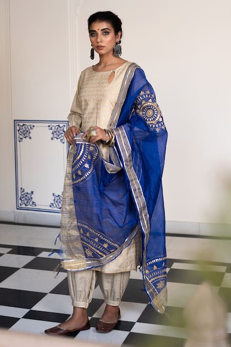 Ivory chanderi kurta featuring antique gold hand block print, keyhole round neck & puff sleeves. Paired with printed harem style pants and a royal blue chanderi dupatta adorned with placement thread & gota embroidery.