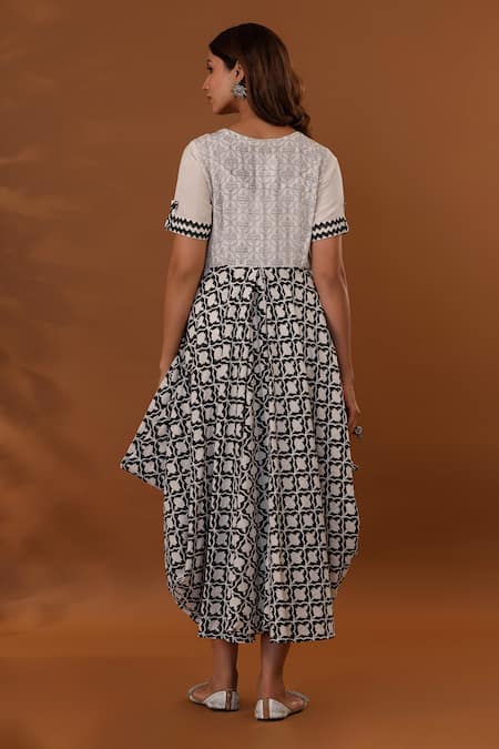 Black and white monochrome floral handblock printed draped dress featuring a V-neckline and half sleeves. Comes with a reversible potli bag for added convenience.
