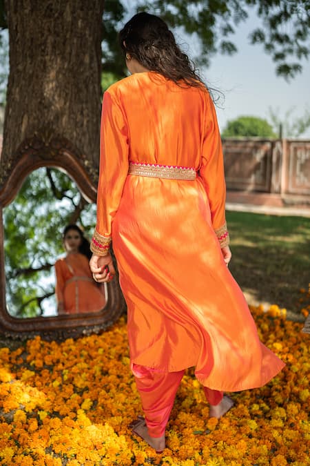 Peach kurta featuring handwork embroidered sleeves and a round keyhole neckline. Paired with an A-line jacket, detachable belt, and pink dhoti pant.