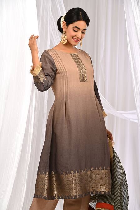 Shaded brown pure chanderi A-line kurta featuring real zari and banarasi weaving. Paired with matching pant and striped dupatta with metallic fringed lace hem.