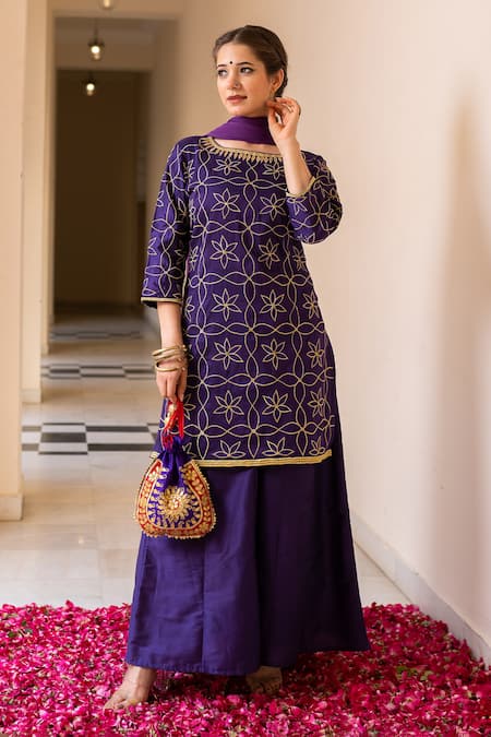 Purple cotton silk kurta featuring intricate gold zari embroidery and gota work. Paired with a flared panelled sharara and a chiffon dupatta.