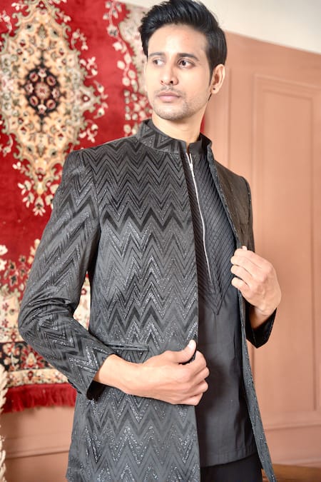 Black bandhgala featuring chevron woven motifs and a mandarin collar. Paired with a pleated short kurta and trouser.