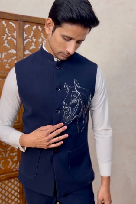 Blue bundi featuring cutdana embroidery in horse pattern. Paired with a white shirt and trouser.