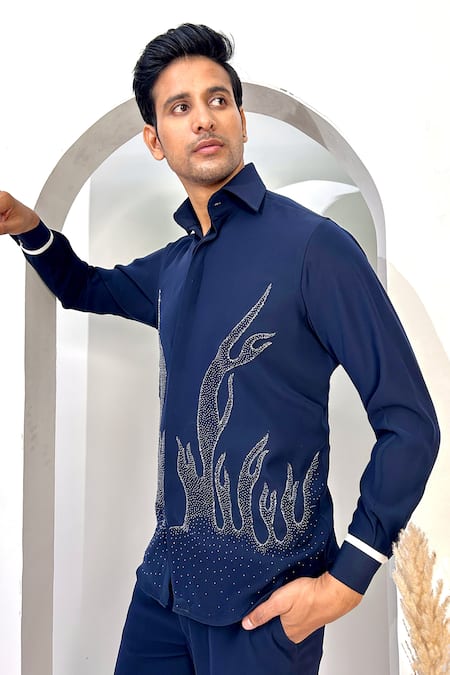 Blue shirt featuring metallic cutdana embroidery in flame pattern. Paired with matching trousers for a coordinated look.
