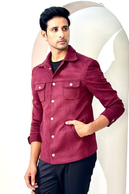 Wine full sleeve jacket crafted from suede fabric featuring a collar neckline and front button closure