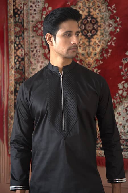Black kurta featuring a mandarin collar and front zipper with pleated detailing. Paired with matching trousers in poly viscose fabric.