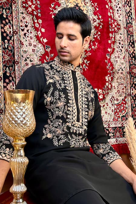 Black kurta featuring resham embroidery in a floral pattern. Paired with a matching pyjama.