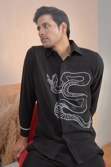 Black shirt featuring metallic resham, moti, and sequin embroidery in a snake pattern. Paired with matching trousers for a complete look.