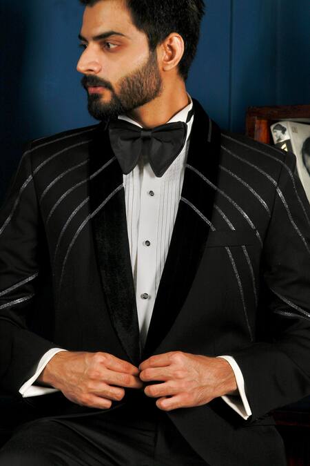Black tuxedo featuring tape stripe embellishments, shawl collar, and welt pockets. Paired with a pleated shirt, trouser, and satin bowtie.