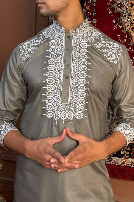 Grey kurta featuring full sleeves, mandarin collar, and intricate resham embroidery in a floral pattern. Paired with a matching pyjama.