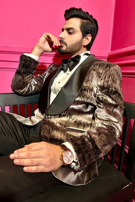 Shimmer abstract gradient pattern on tuxedo, Welt pockets on tuxedo, Pleated shirt design