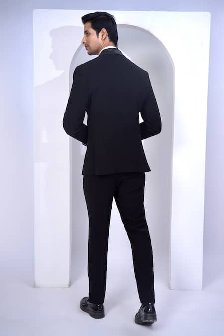 Black blazer featuring zari and sequin floral embroidery. Paired with a white pleated shirt, trouser, and bow tie.