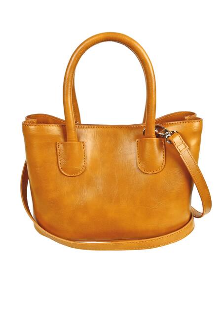 Brown vegan leather small tote bag featuring a detachable sling and two zipped interior pockets