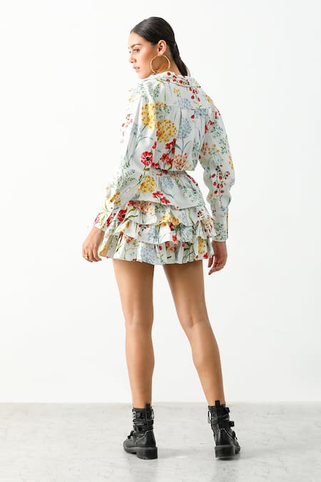 Multicoloured floral print jacket. Paired with a printed layered skirt and bralette.