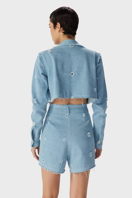 Iced blue cropped denim jacket featuring a notched collar and frayed edges