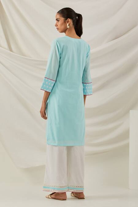 Blue kurta featuring V-neckline, three-quarter sleeves, and embroidered detail on the neckline and sleeve borders. Paired with palazzo pants and a dupatta, it includes side slit pockets and pink piping accents.