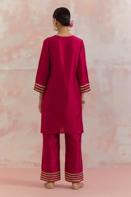 Red Raw Silk Gota Work V Neck Kali Kurta And Palazzo Set