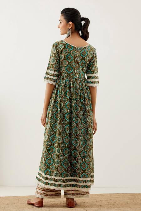 Green cotton anarkali with floral printed motifs, lace work & V neckline. Paired with printed palazzo & contrast dupatta.