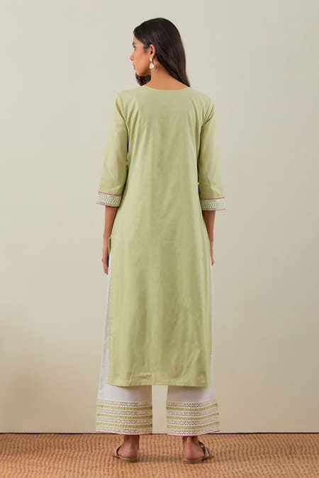 Green Cotton Embroidery, Sequins Round Neck Rozana Placket Straight Kurta