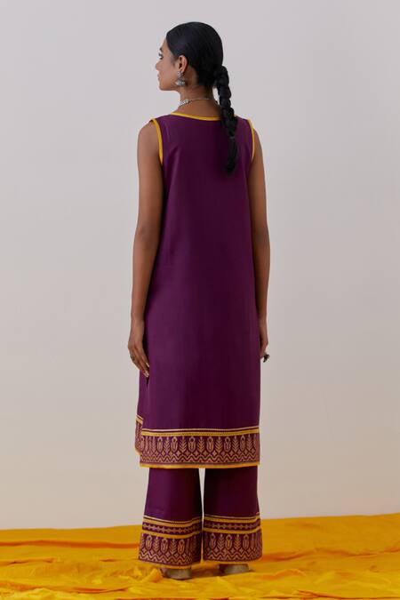 Purple sleeveless cotton slub straight kurta featuring hand-block printed hem and gota lace embellishments. Paired with matching palazzo pants.