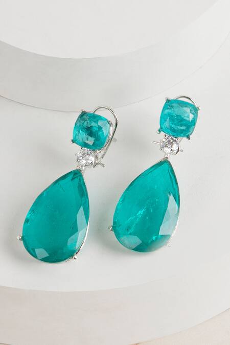 Ocean blue droplet earrings featuring a pear-shaped tourmaline stone with solitaire diamond-like crystal embellishments