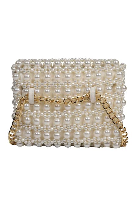 Hand embroidered pearls across the surface, Flap detail for closure, Adjustable lobster clasp belt for versatility