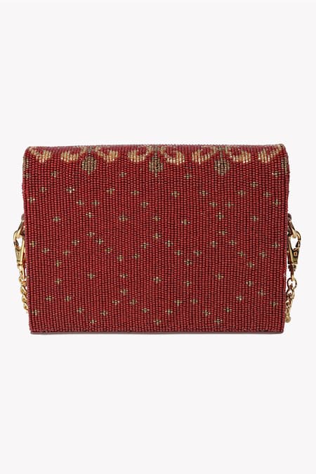 Maroon box handbag featuring all-over bead embellishment