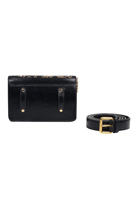 Black sling bag featuring a hand beaded floral motif flap with a detachable leather belt and chain shoulder strap